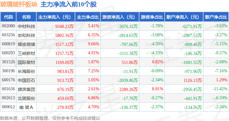 从资金流向上来看,当日玻璃玻纤板块主力资金净流入2.06亿元,游资资金净流出7919.04万元,散户资金净流出1.27亿元。玻璃玻纤板块个股资金流向见下表: